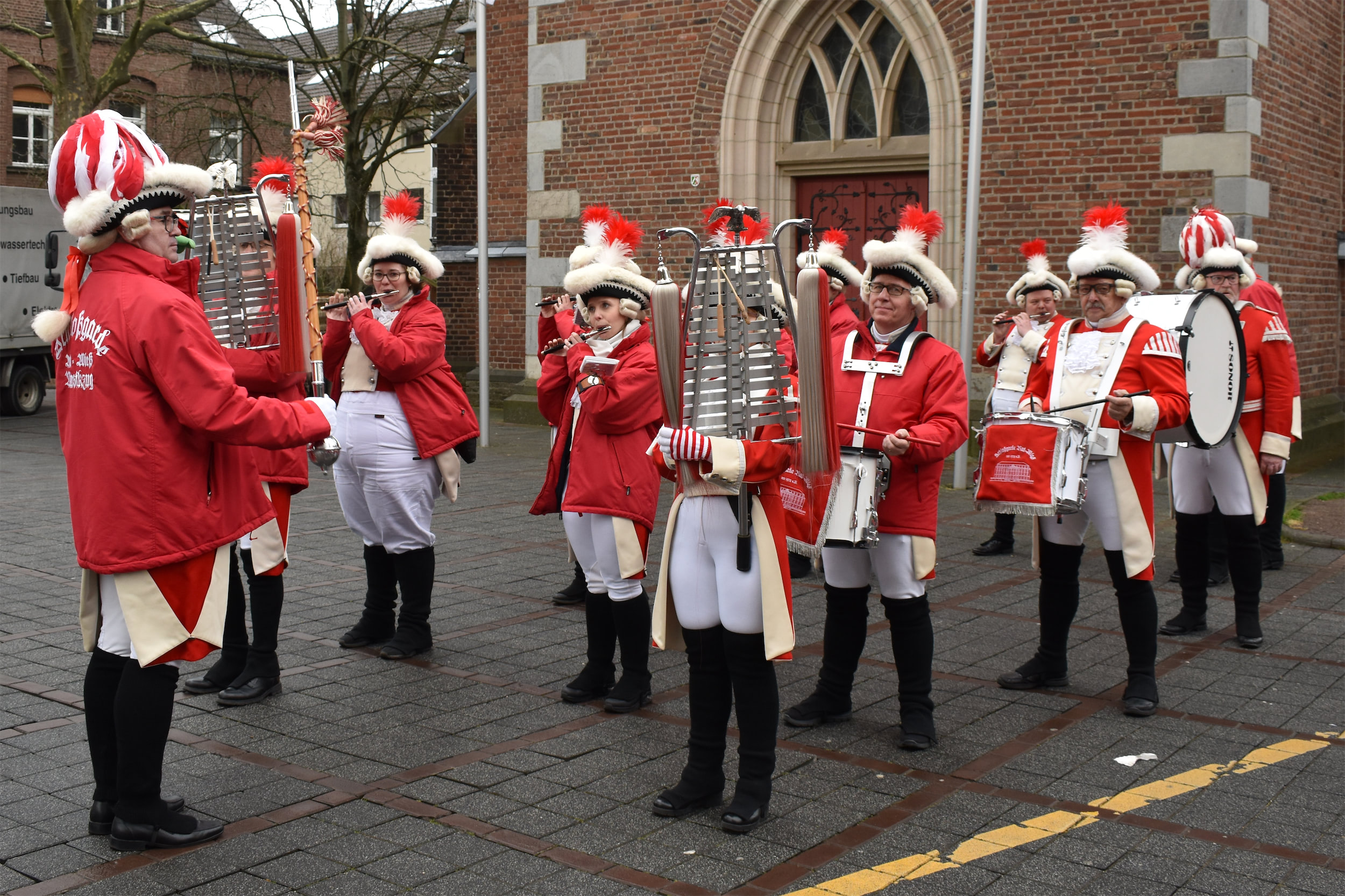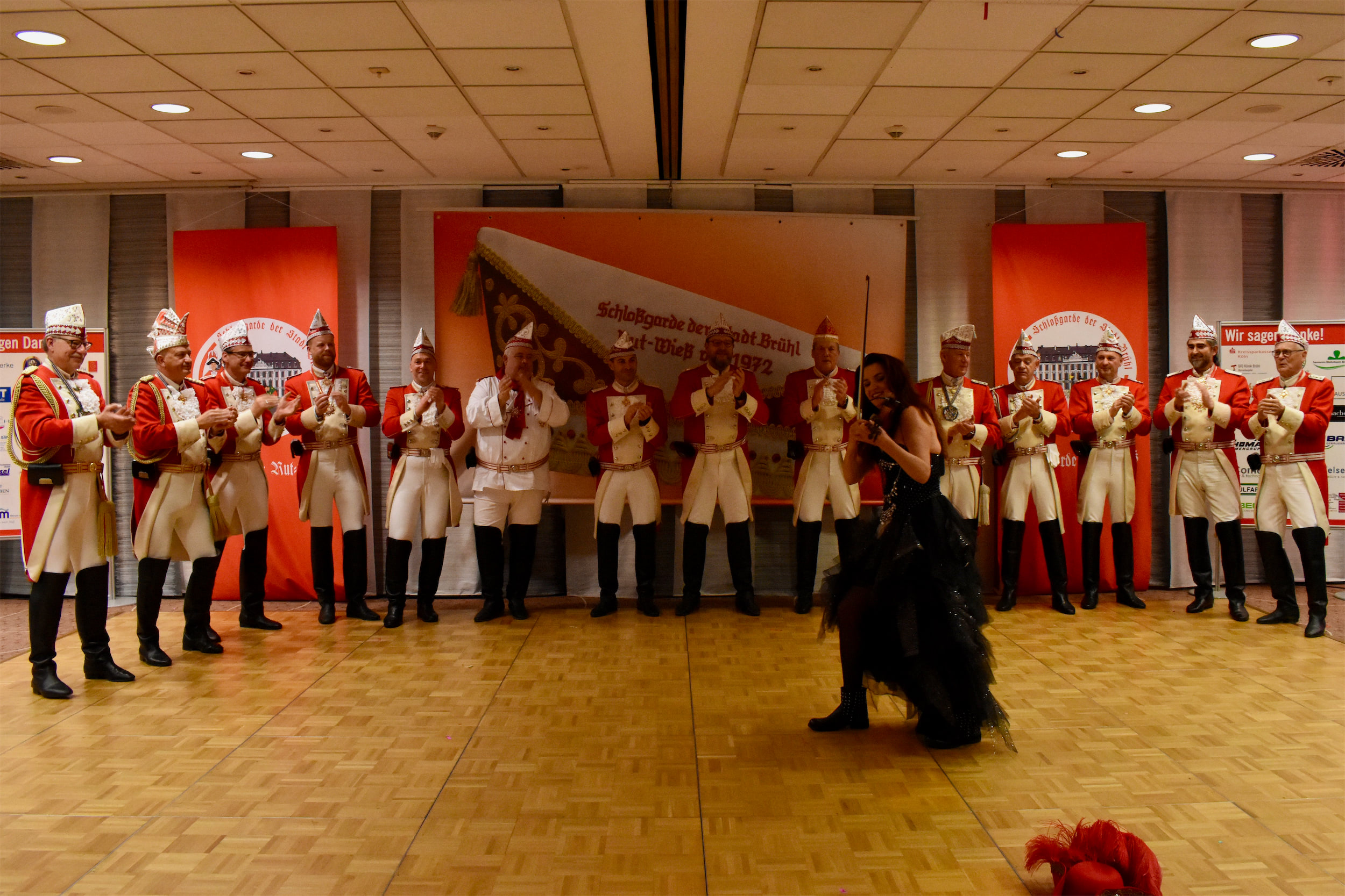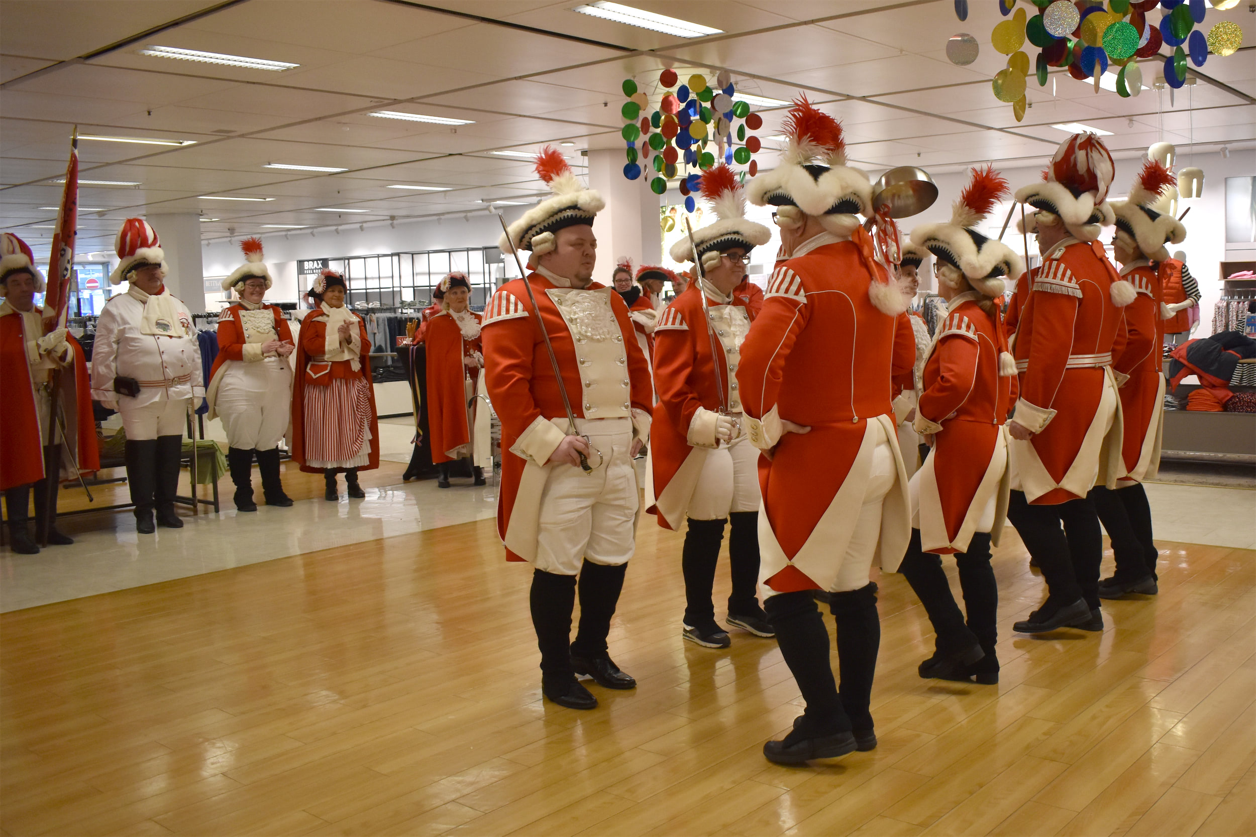 An Weiberfastnacht verabschiedete sich unser langjähriger Musikverein „Gut Klang“ Keldenich sich von uns und zwar im Aachener Modehaus und zu unserer Überraschung, mit einem eigens einstudierten Gardetanz - dem allerersten Gardetanz der, den der Musikverein bei der Schlossgarde begleitet hat.